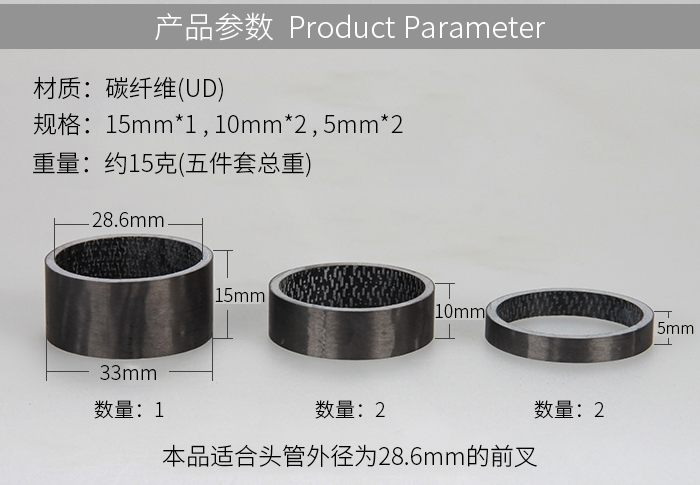 產(chǎn)品名稱:TC-004碳纖墊圈 規(guī)格:15mm一個,10mm兩個,5mm兩個 外觀:碳纖維UD布 總重:約15克