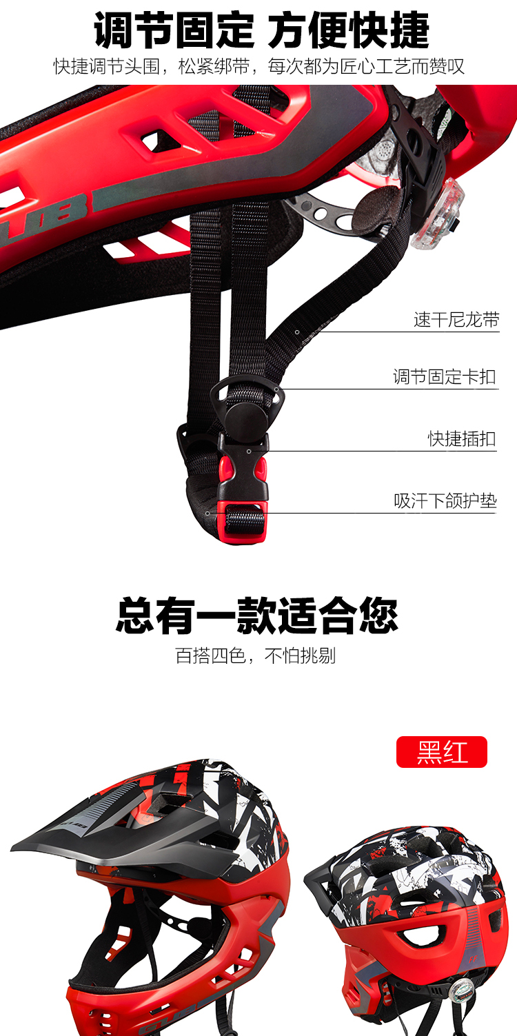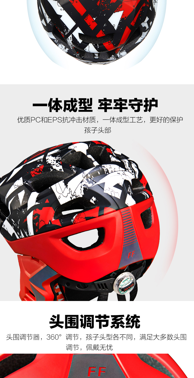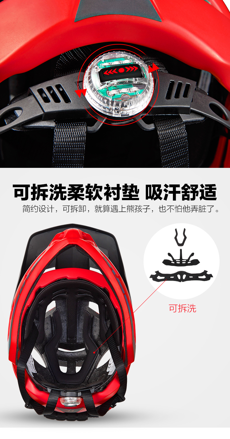 特色:全盔半盔自由切換,加長帽檐貼心保護孩子的眼睛,酷炫反光標涂裝讓騎行更酷更有樂趣,同時頭圍調(diào)節(jié)系統(tǒng)自帶的尾燈起到警示作用,讓孩子的夜騎更安全。