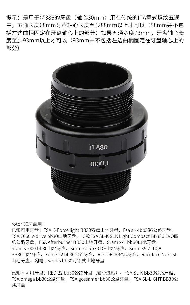 提示:是用于將386的牙盤(軸心30mm)用在傳統(tǒng)的ITA意式螺紋五通中,五通長度68mm