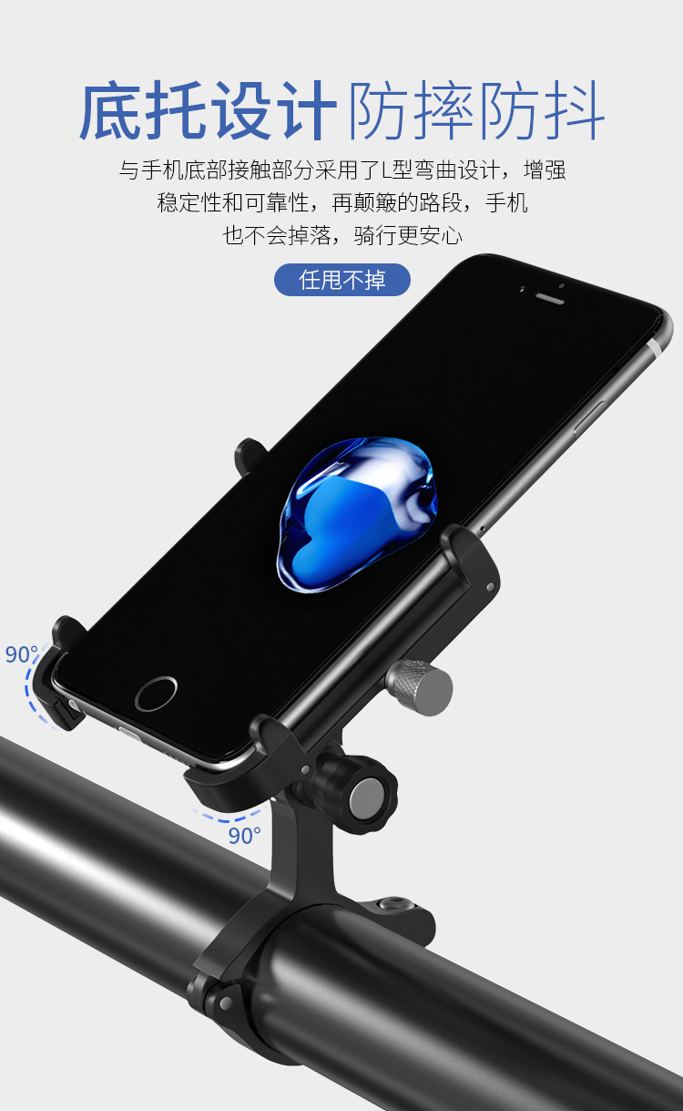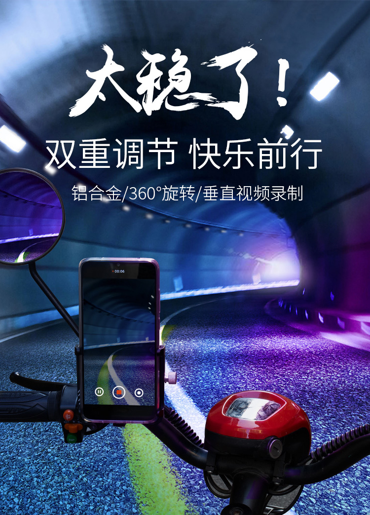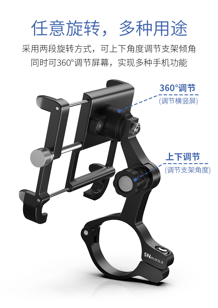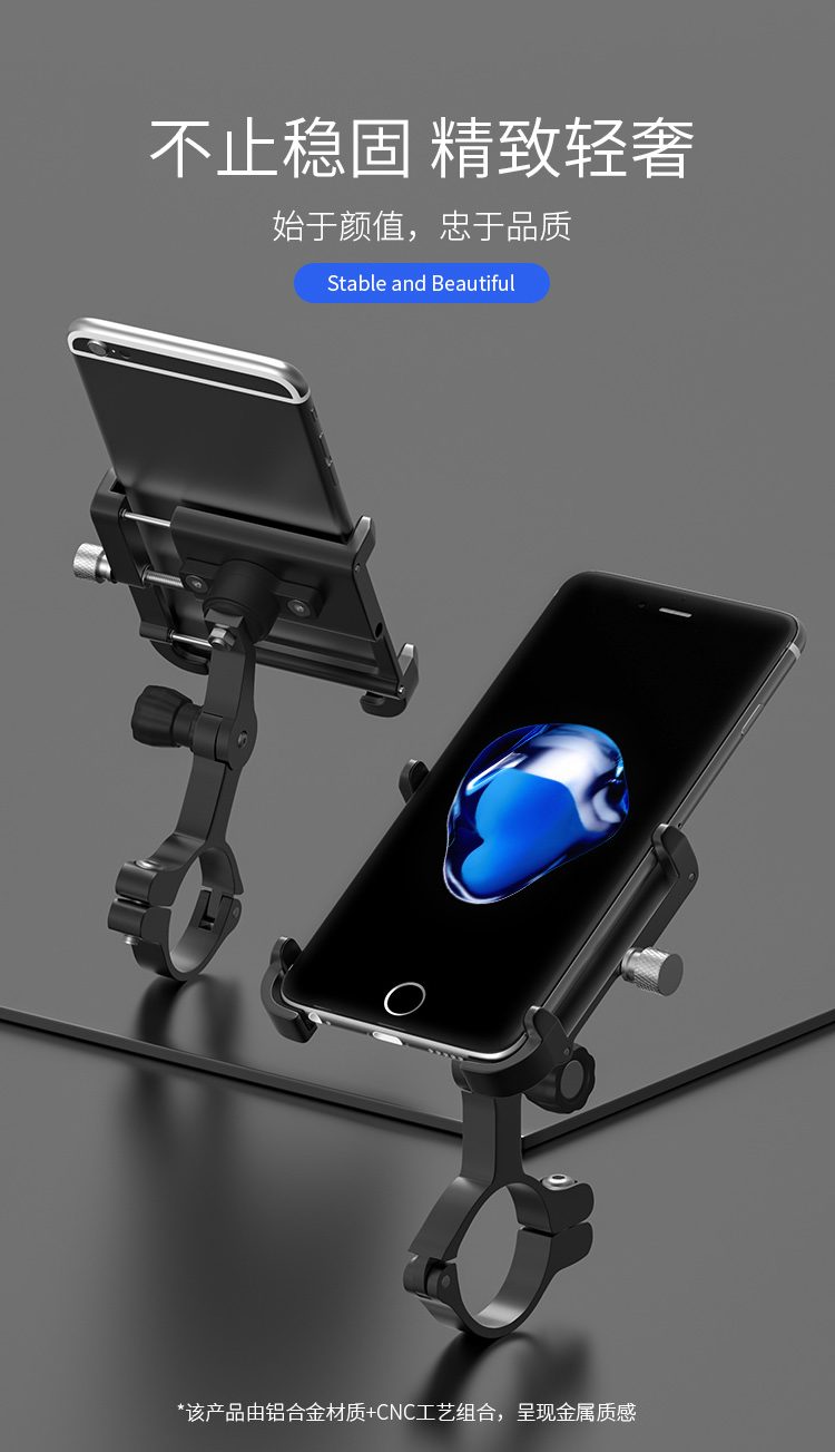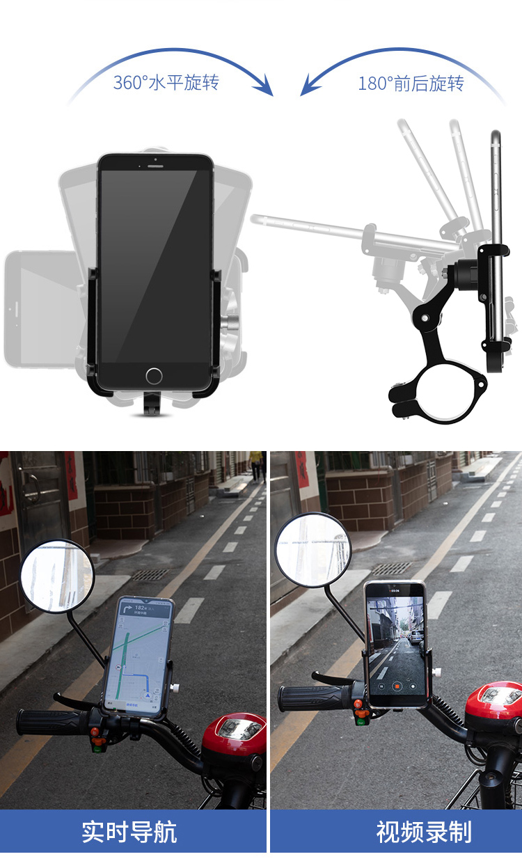 特點:全鋁合金架體,雙重調節(jié),支持前后角度及平面360度調節(jié),支持手機架垂直固定,讓手機秒變運動相機,記錄一路精彩!高兼容性不挑手機型號,自行車、電動車等都可使用!