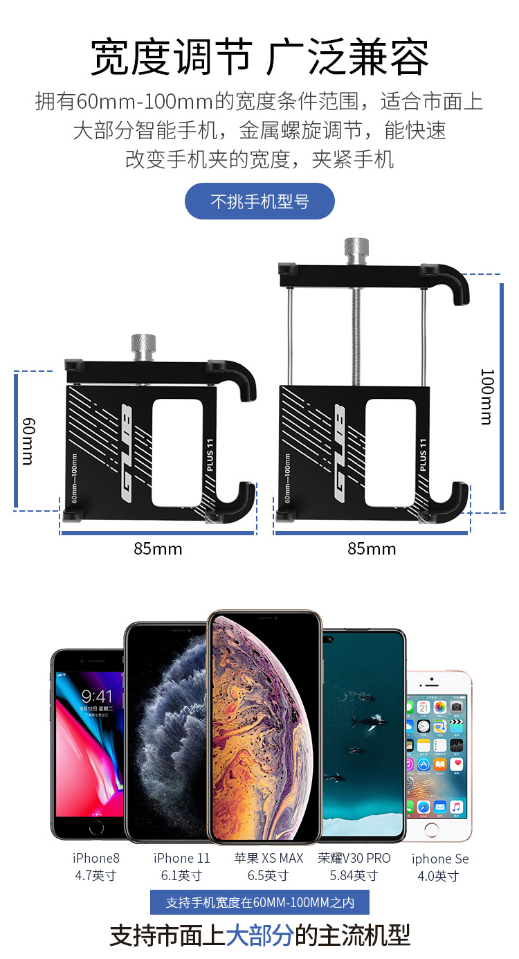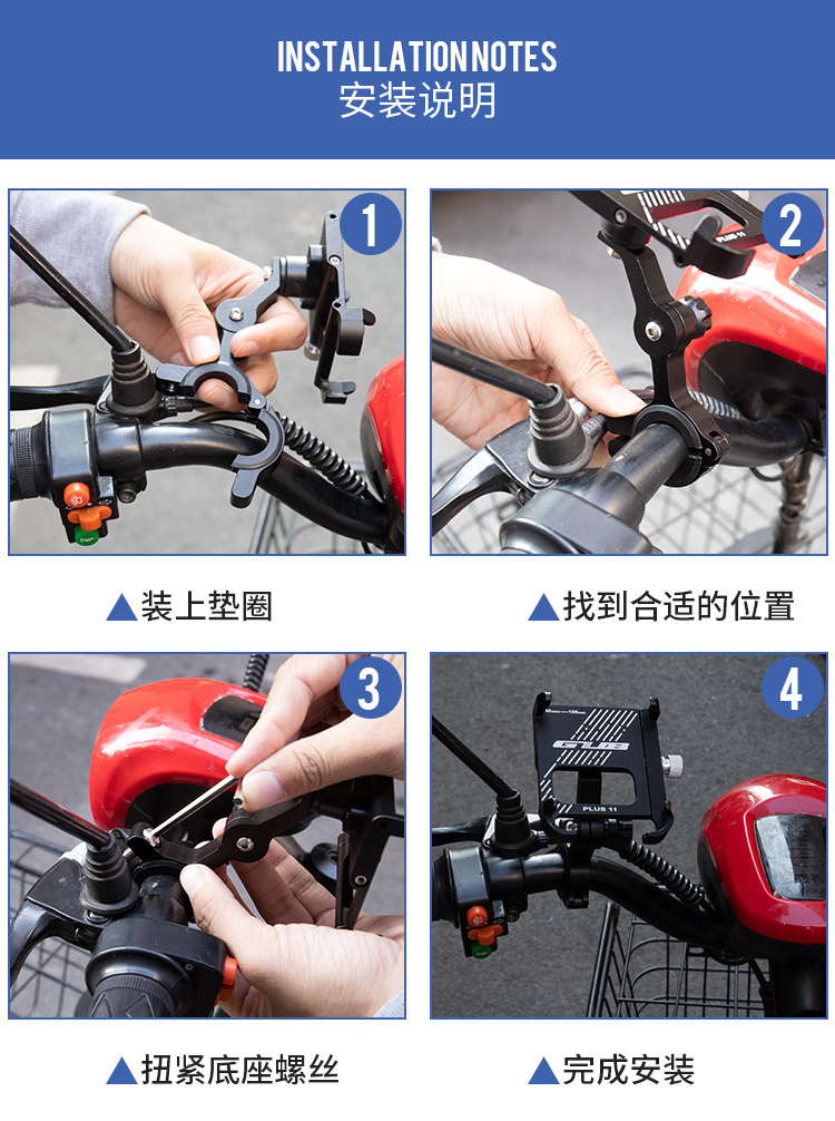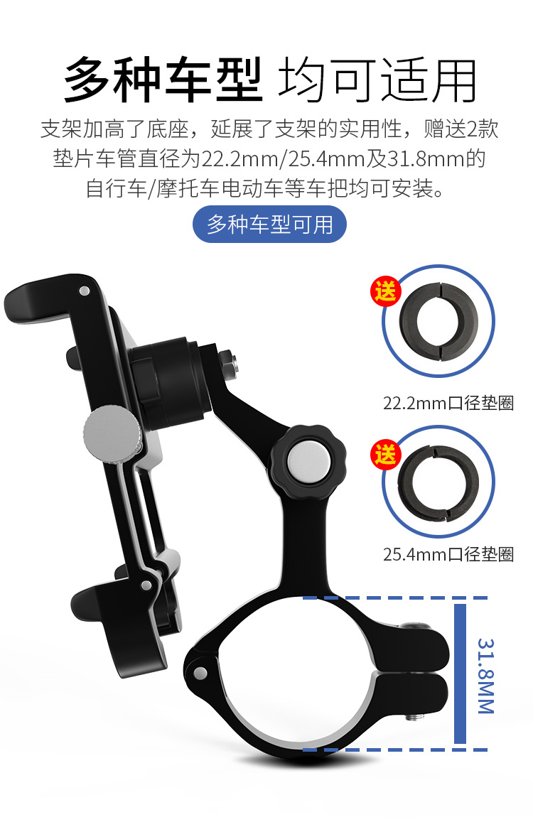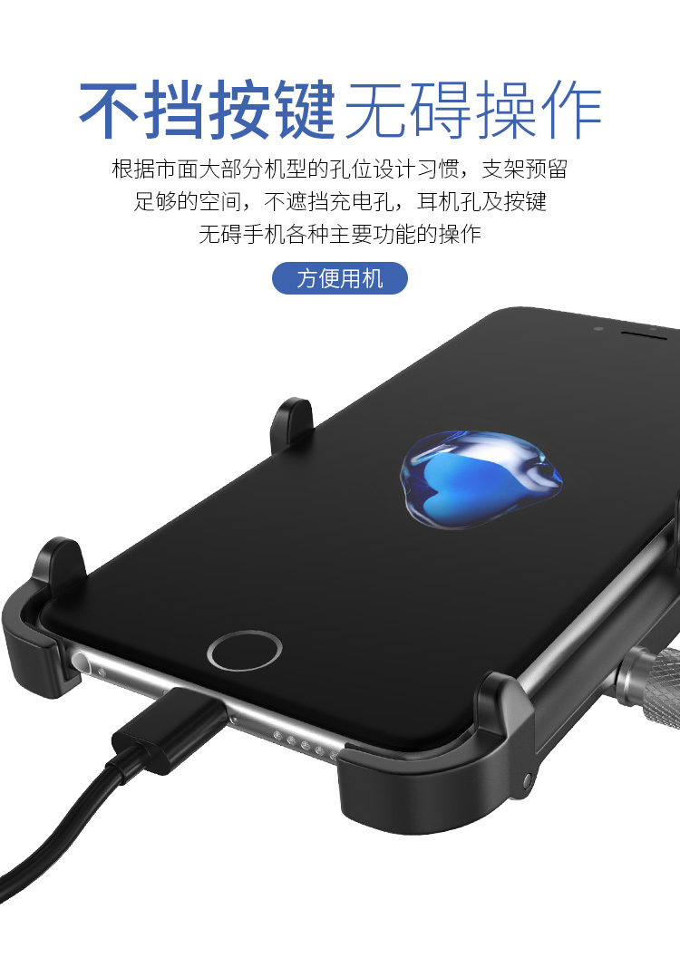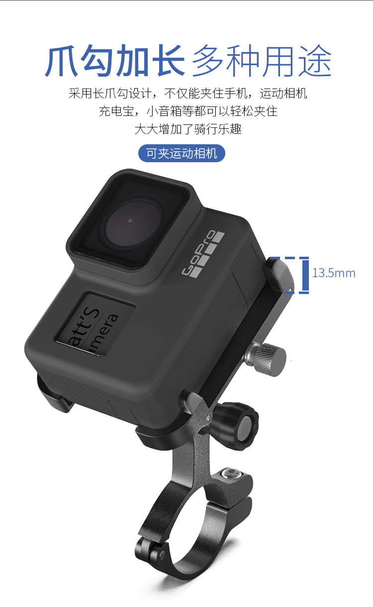 特點:全鋁合金架體,雙重調節(jié),支持前后角度及平面360度調節(jié),支持手機架垂直固定,讓手機秒變運動相機,記錄一路精彩!高兼容性不挑手機型號,自行車、電動車等都可使用!