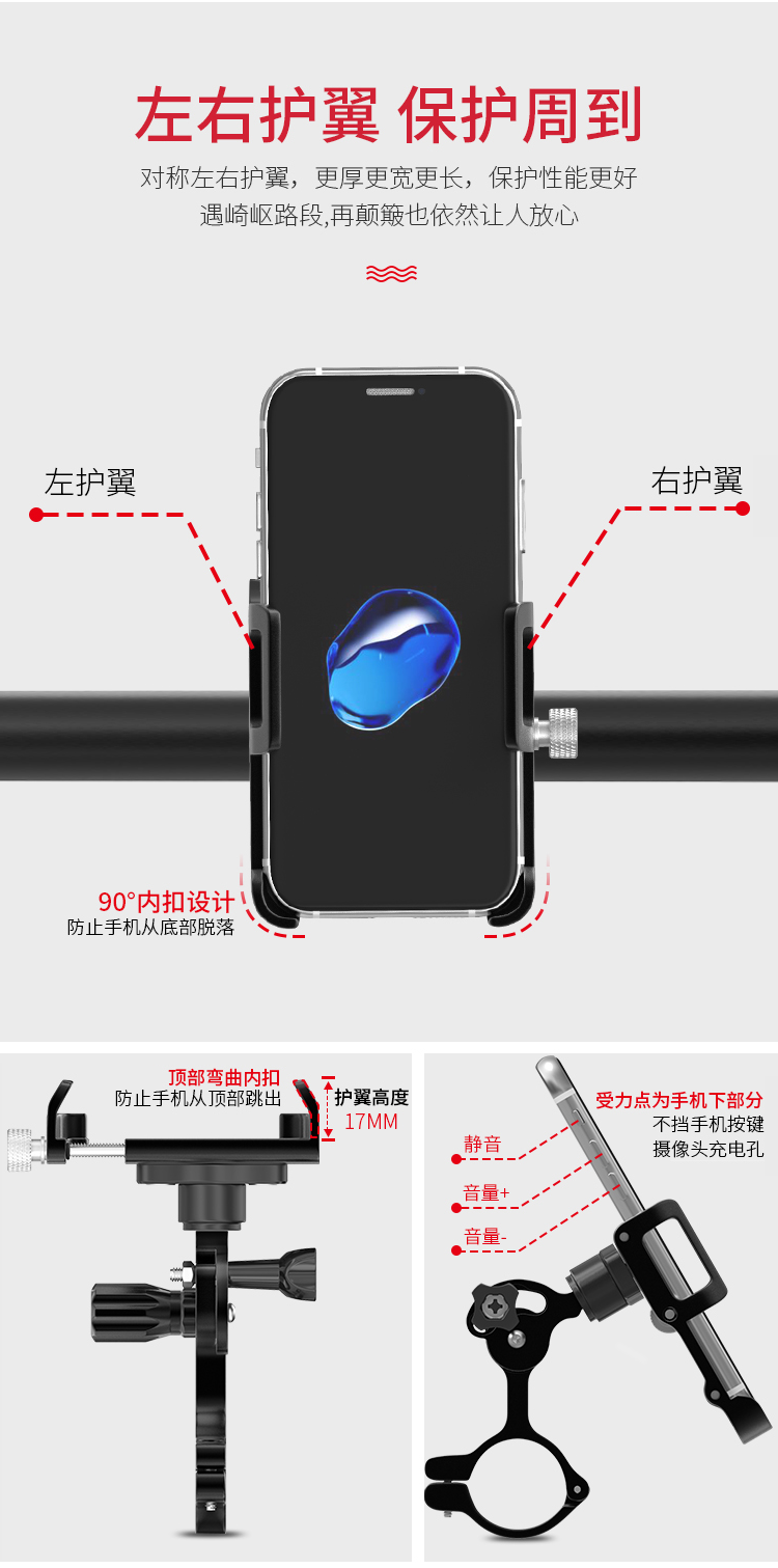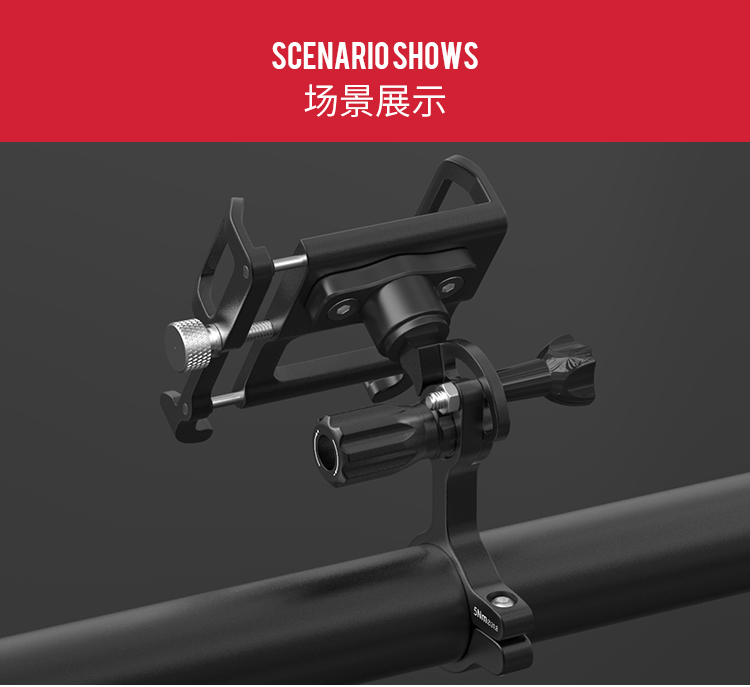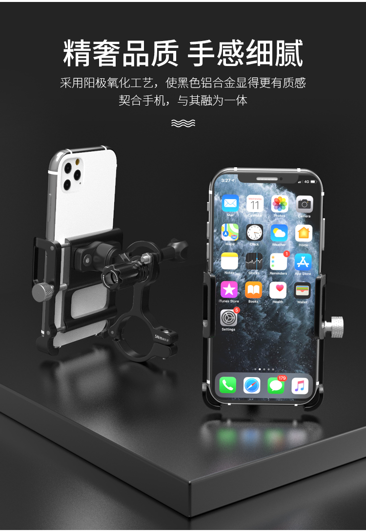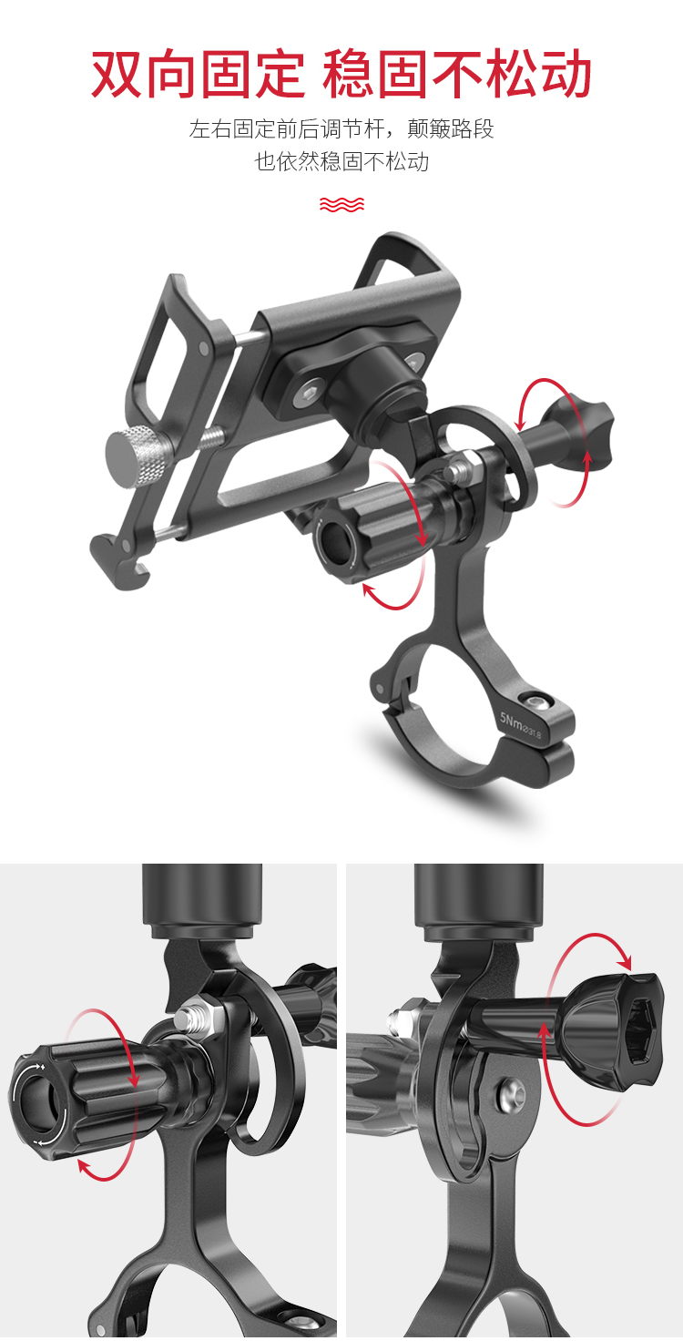 特點:鋁合金架體,雙緊固旋鈕拒絕抖動,高兼容性不挑手機型號,自行車、電動車等都可使用!