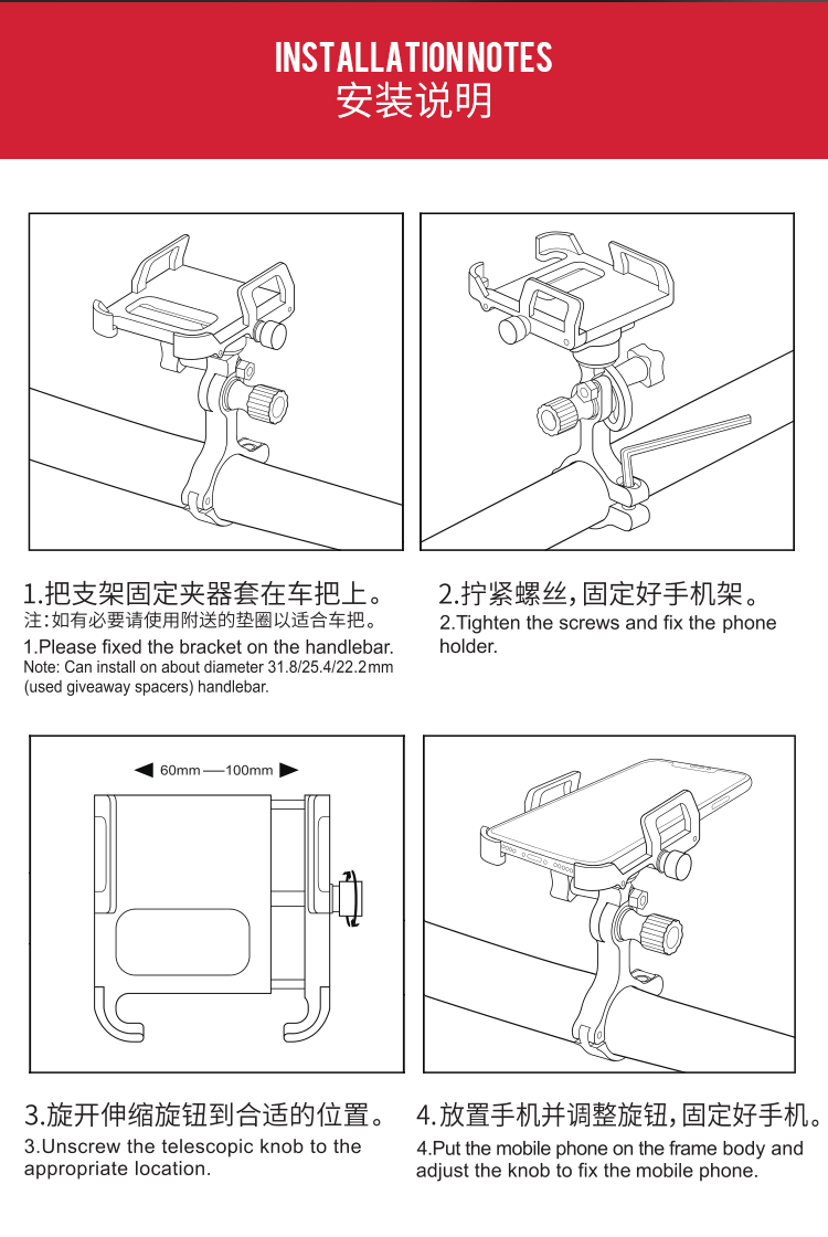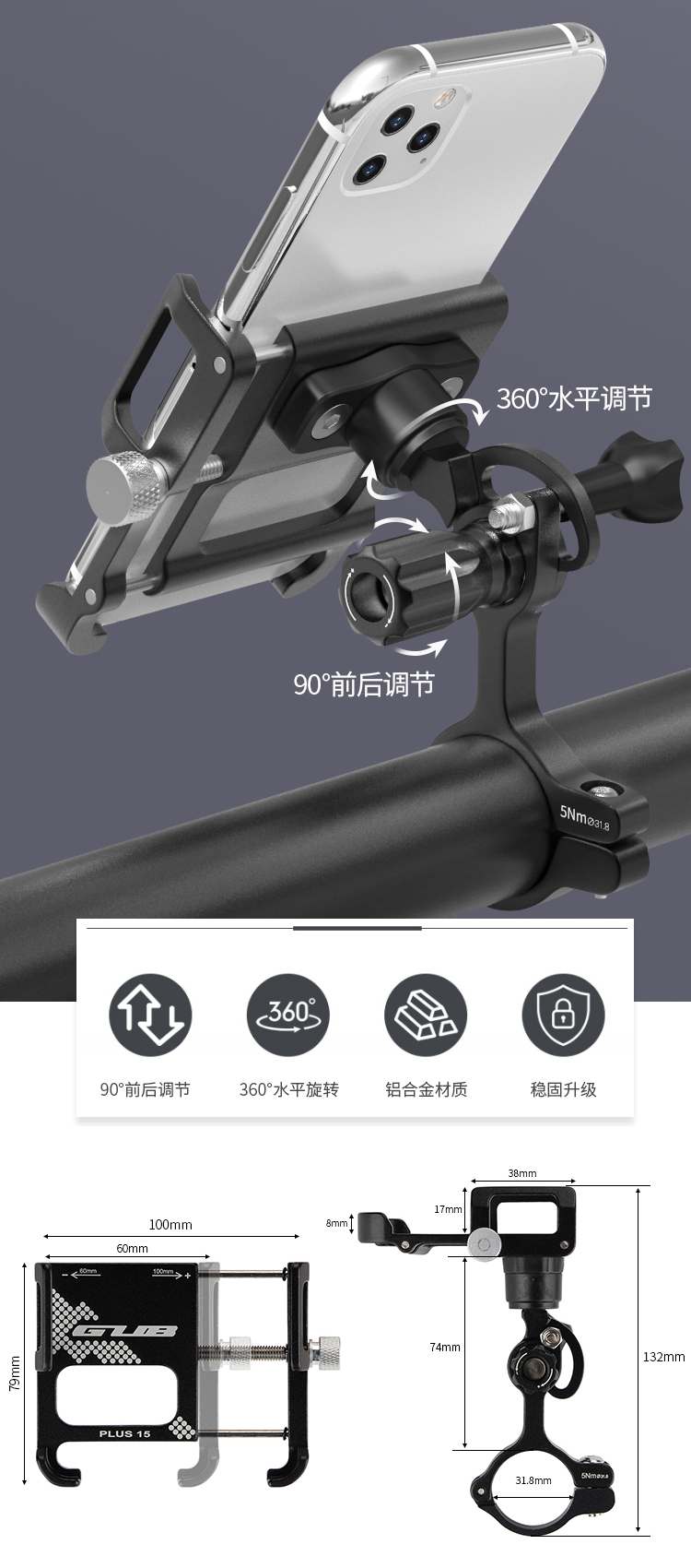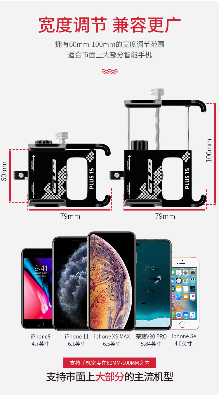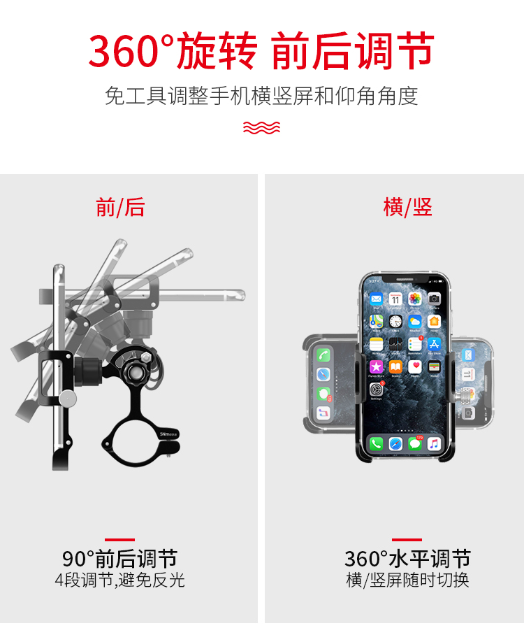 特點:鋁合金架體,雙緊固旋鈕拒絕抖動,高兼容性不挑手機型號,自行車、電動車等都可使用!