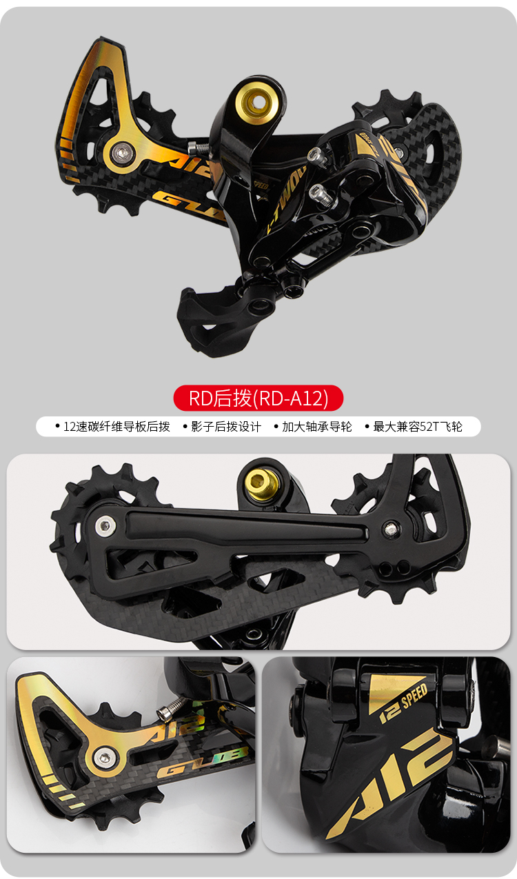 后撥:12速碳纖維導(dǎo)板后撥,影子后撥設(shè)計(jì),加大軸承導(dǎo)輪,最大兼容52T飛輪