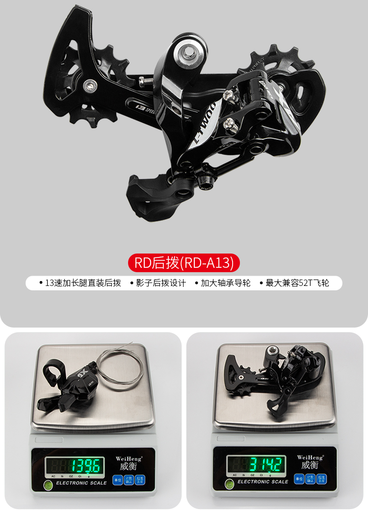 后撥:13速加長(zhǎng)腿直裝后撥,影子后撥設(shè)計(jì),加大軸承導(dǎo)輪,最大兼容52T飛輪