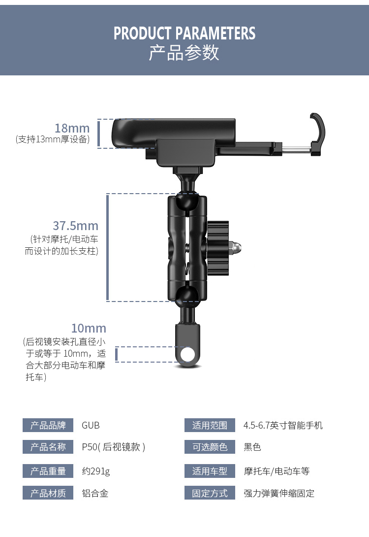 名稱:GUB P50 鋁合金手機(jī)支架(后視鏡款)