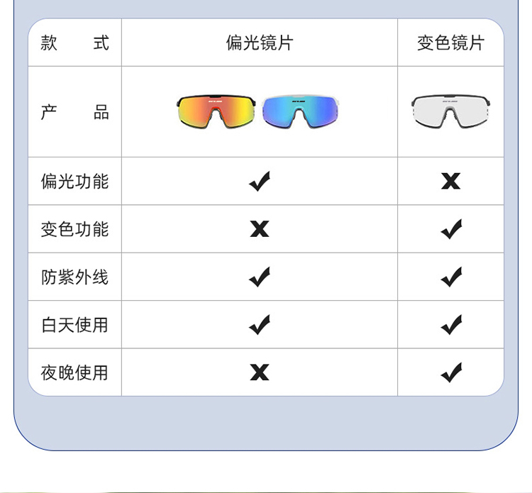 顏色:啞黑/透明變色+炫紅偏光、亮白/透明變色+白冰藍(lán)偏光