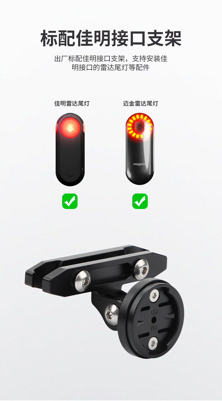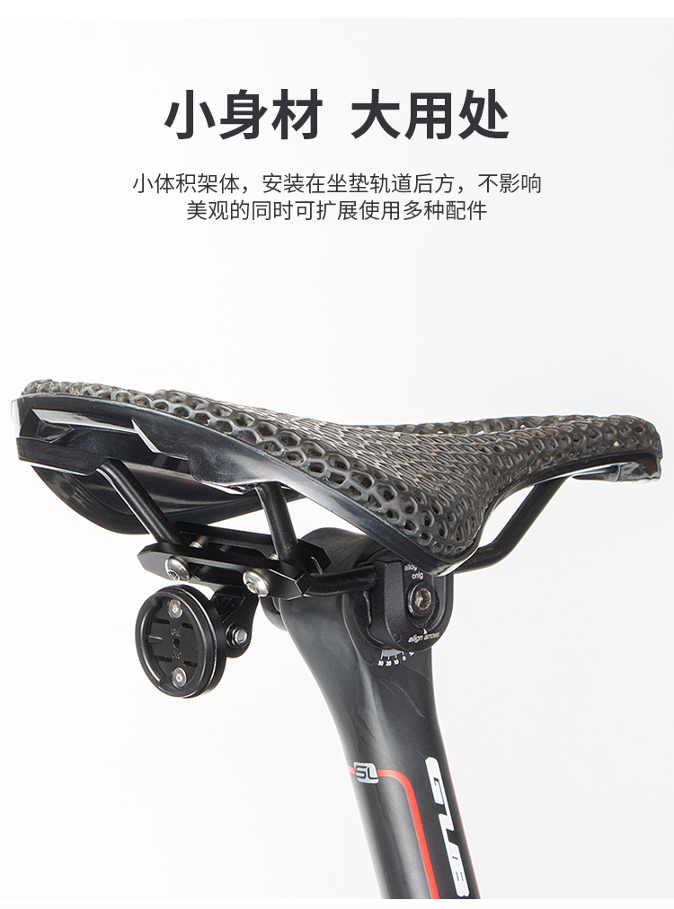 特點:鋁合金材質(zhì)堅固耐用,安裝在坐墊軌道后方,標配佳明接口支架,適用于佳明接口的尾燈安裝,也可以直接安裝GOPRO運動相機等配件