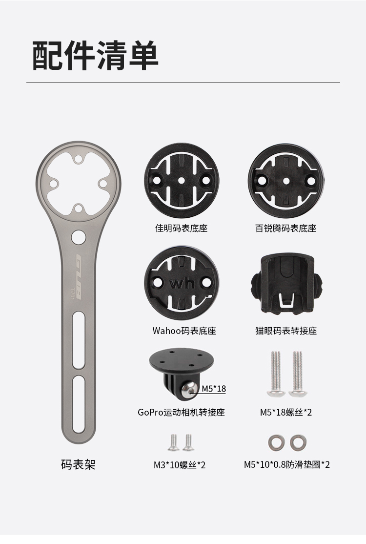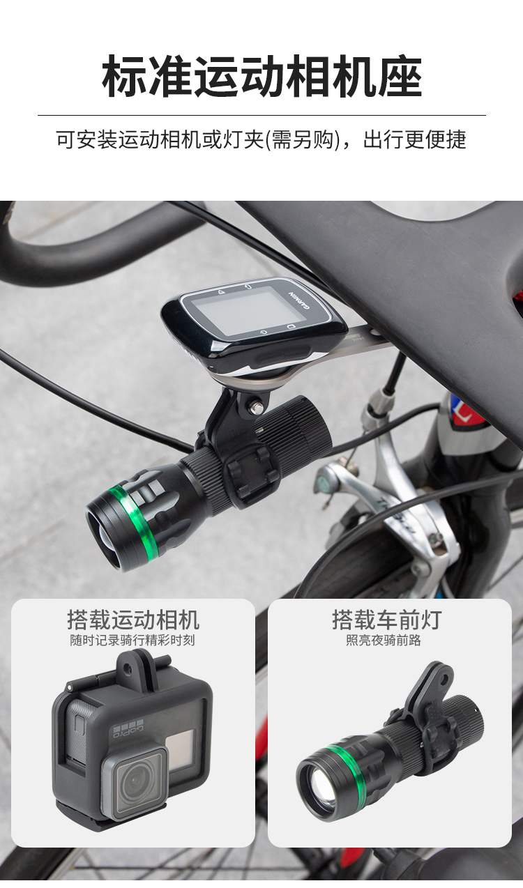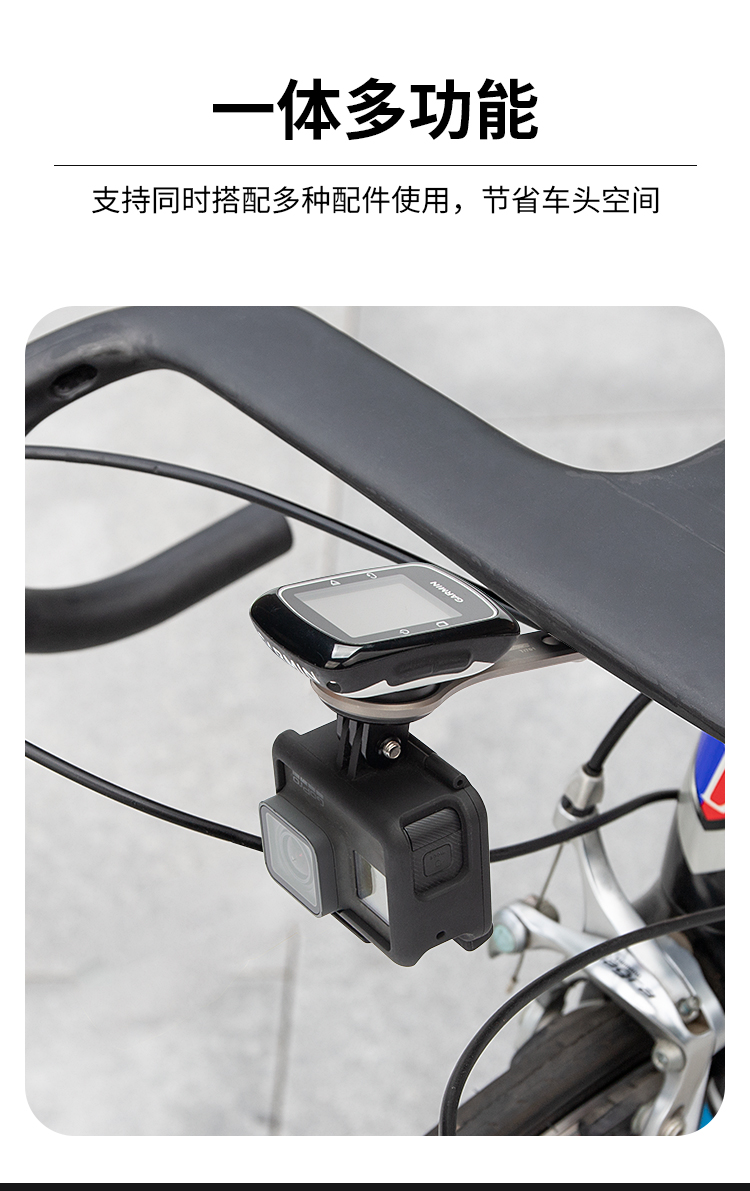 特點:鈦合金架體,居中安裝節(jié)省空間(一體把專用),兼容多種碼表,標(biāo)配運動相機接座,可擴展使用運動相機等配件