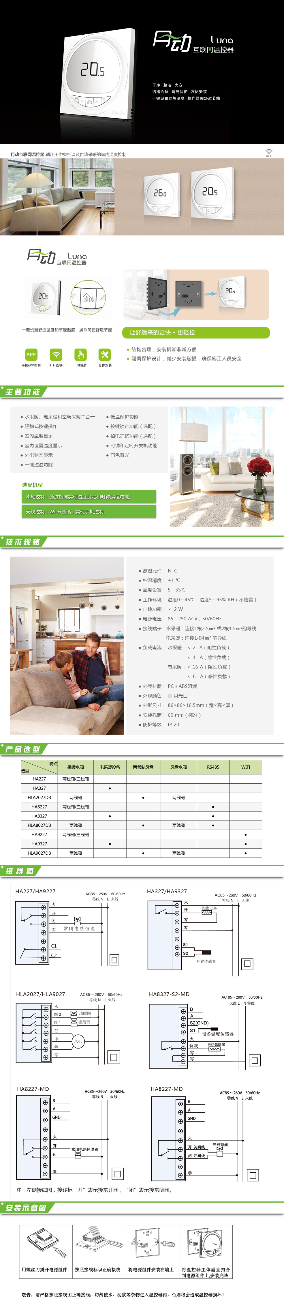 月動采暖溫控器包括“本地控制、有線控制、無線控制”三種類型,適用于家庭地板采暖系統(tǒng)或散熱器采暖系統(tǒng)的室內(nèi)溫度控制。外觀干凈整潔大方,結(jié)構(gòu)合理極易拆裝。人性化隔離保護(hù)設(shè)計防止安裝破損,保證施工人員安全。采暖型產(chǎn)品一鍵設(shè)置舒適溫度和節(jié)能溫度,極大方便用戶的操作使用。
