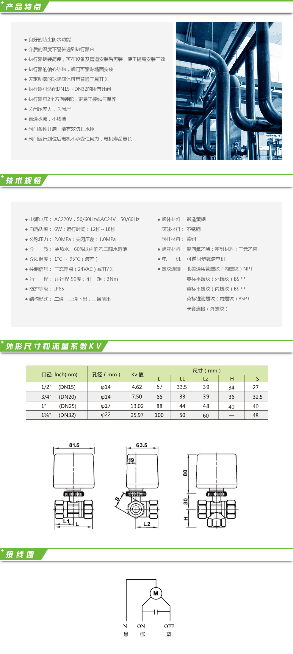 BV03系列電動(dòng)球閥主要用于中央空調(diào)冷熱水系統(tǒng),按實(shí)際需要精確控制冷、熱介質(zhì)的流量,不會(huì)造成溫度的劇烈變化,達(dá)到實(shí)時(shí)精確控制室溫之目的??刂崎y由雙向電機(jī)驅(qū)動(dòng),電機(jī)與溫控器通過公共端、開啟端、閉合端鏈接。溫控器不斷采樣、處理現(xiàn)場數(shù)據(jù),發(fā)出控制信號(hào),令電動(dòng)球閥電機(jī)運(yùn)行或停止,控制電動(dòng)球閥的開閉程度,冷水或熱水進(jìn)入風(fēng)機(jī)盤管,為房間提供冷氣或暖氣;當(dāng)室溫達(dá)到溫控器設(shè)定值時(shí),溫控器令電動(dòng)球閥斷電,使閥門開度處于最佳狀態(tài),室溫始終保持在溫控器設(shè)定的溫度范圍內(nèi)。
