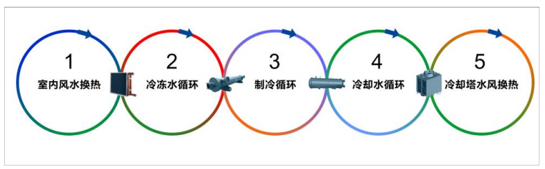 全面精細(xì)化實(shí)現(xiàn)高效制冷機(jī)房設(shè)計(jì),歸納于對五大循環(huán)系統(tǒng)的深入研判后的能效提升,它們分別是:1)室內(nèi)水風(fēng)循環(huán);2)冷水循環(huán);3)制冷循環(huán);4)冷卻水循環(huán);5)冷卻塔水風(fēng)換熱循環(huán),如下圖所示。其中與冷卻水系統(tǒng)節(jié)能直接相關(guān)的循環(huán)有冷卻水循環(huán)和冷卻塔風(fēng)水換熱循環(huán)。冷卻水循環(huán)涉及冷卻水供回水溫差;冷卻塔水風(fēng)換熱循環(huán)涉及冷卻塔供水溫度和室外濕球溫度的溫差,是為兩個(gè)溫差。