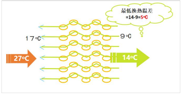 過去很長的一段時(shí)間內(nèi)冷水系統(tǒng)大溫差的設(shè)計(jì)及其理論為暖通設(shè)計(jì)行業(yè)所耳熟能詳,相關(guān)論文闡述也很多,冷水大溫差多為降低冷水出水溫度,同時(shí)提高冷水回水溫度為代表(姑且叫第一類大溫差)如典型溫差為 7℃即 6-13℃循環(huán)溫度,末端采用吊裝空調(diào)箱的大型購物中心項(xiàng)目,如筆者親身經(jīng)歷的合肥萬科廣場購物中心項(xiàng)目,見文獻(xiàn)[2]。這類大溫差的本質(zhì)是:在主機(jī)供水溫度(出水溫度低于 7℃)和既定溫差(溫差大于 5℃)下選型同時(shí)選擇能效比高的冷水泵,在滿足計(jì)算制冷量和規(guī)范的主機(jī)制冷量前提下,主機(jī)能耗的增加的數(shù)值小于水泵能耗的下降的數(shù)值,使得冷水循環(huán)側(cè)的主機(jī)和水泵的綜合能效最小。近年來出現(xiàn)的冷水側(cè)大溫差即中溫冷水機(jī)組的大溫差(姑且叫第二類大溫差),即通過改進(jìn)末端空調(diào)設(shè)備結(jié)構(gòu)形式,只要空調(diào)機(jī)組出風(fēng)干球溫度控制在≤14℃以下,系統(tǒng)可以提供不同的供回水溫度(供水溫度大于 7℃,回水溫度大于 12℃),冷水系統(tǒng)可以提供 9.5℃-14.5℃、8.8℃-14.8℃、8℃-15℃等不同的供回水溫度組合,如文獻(xiàn)三[3]中南京三山街大型購物中心高效制冷機(jī)房的大溫差供回水溫度為 10℃-16℃;文獻(xiàn)四[4]提到的五邑大學(xué)教學(xué)樓高效制冷機(jī)房的供回水溫度為 10℃-18℃,當(dāng)然該項(xiàng)目較為特殊,是配合了改進(jìn)的末端(需要采用全新的中溫末端設(shè)備,從換熱能力、出風(fēng)溫度、風(fēng)側(cè)壓降、水側(cè)壓降等四個(gè)維度進(jìn)行全面優(yōu)化)及輔助電風(fēng)扇的采用,能達(dá)到所需要的溫濕度要求。因此第二個(gè)階段的冷水大溫差是提高供水溫度,同時(shí)提高供回水溫差的形式。下圖為中溫水大溫差的六排管逆流換熱圖。采用中溫變頻空調(diào)系統(tǒng)制冷機(jī)房某項(xiàng)目能效可達(dá)到 6.85。