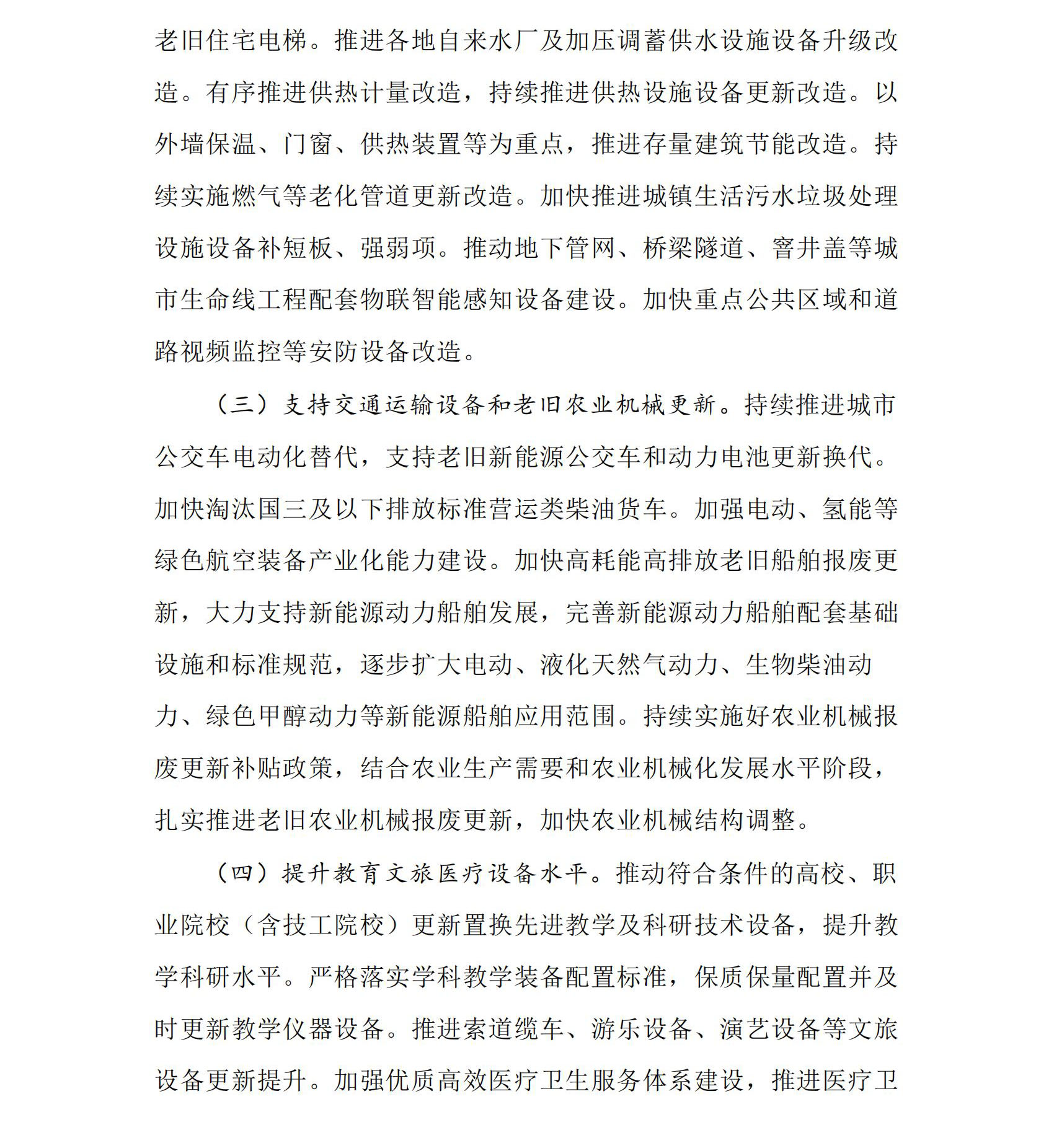 (二)加快建筑和市政基礎(chǔ)設(shè)施領(lǐng)域設(shè)備更新。圍繞建設(shè)新型城鎮(zhèn)化,結(jié)合推進(jìn)城市更新、老舊小區(qū)改造,以住宅電梯、供水、供熱、供氣、污水處理、環(huán)衛(wèi)、城市生命線工程、安防等為重點(diǎn),分類推進(jìn)更新改造。加快更新不符合現(xiàn)行產(chǎn)品標(biāo)準(zhǔn)、安全風(fēng)險(xiǎn)高的老舊住宅電梯。推進(jìn)各地自來水廠及加壓調(diào)蓄供水設(shè)施設(shè)備升級改造。有序推進(jìn)供熱計(jì)量改造,持續(xù)推進(jìn)供熱設(shè)施設(shè)備更新改造。以外墻保溫、門窗、供熱裝置等為重點(diǎn),推進(jìn)存量建筑節(jié)能改造。持續(xù)實(shí)施燃?xì)獾壤匣艿栏赂脑臁<涌焱七M(jìn)城鎮(zhèn)生活污水垃圾處理設(shè)施設(shè)備補(bǔ)短板、強(qiáng)弱項(xiàng)。推動地下管網(wǎng)、橋梁隧道、窨井蓋等城市生命線工程配套物聯(lián)智能感知設(shè)備建設(shè)。加快重點(diǎn)公共區(qū)域和道路視頻監(jiān)控等安防設(shè)備改造。