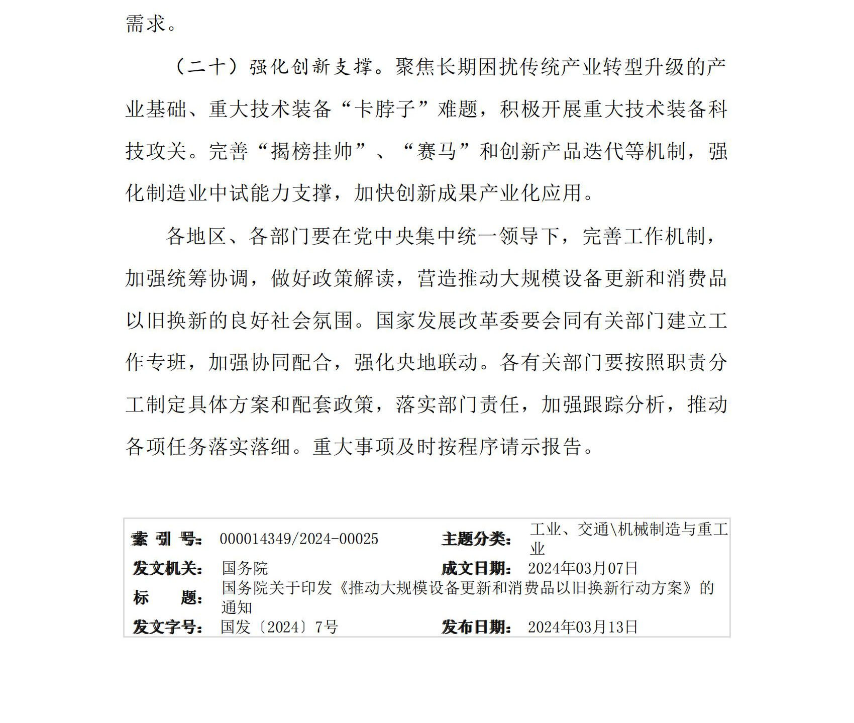 3月13日晚間,國務(wù)院正式印發(fā)《推動大規(guī)模設(shè)備更新和消費(fèi)品以舊換新行動方案》。